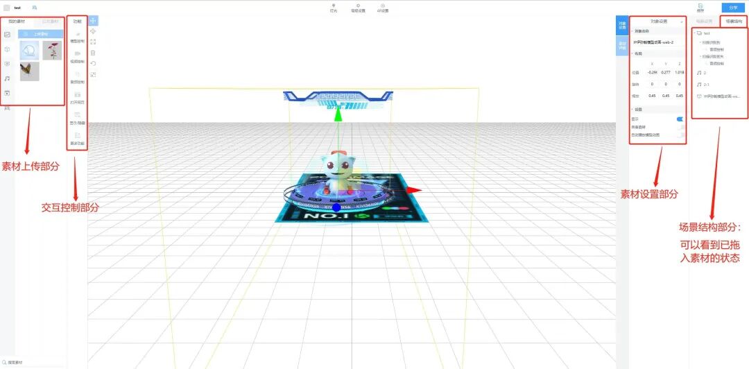 (编辑页面的左侧是素材上传部分和交互控制部分,右侧是素材设置部分,可以调整素材的位置,大小角度等)