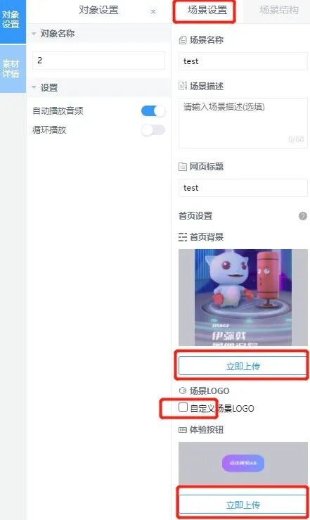 点击右侧“场景设置”,上传首页背景,取消勾选“自定义场景logo” ,然后上传体验按钮图片,这样就设置完成了。