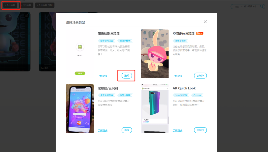 点击屏幕上方的“+AR场景”,选择“图像检测与跟踪场景”这个场景类型