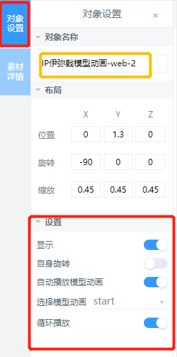 选中模型,在右侧“设置”部分,打开”自动播放模型动画”,打开“循环播放”,模型的交互即设置完成