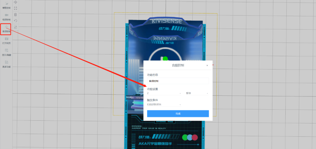 然后再次点击“音频控制”,再次选择这段音频,这次选择“暂停” ,触发条件选择“扫描识别丢失”,点击“完成”