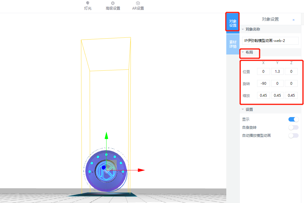 选中模型,点击右侧“对象设置”-“布局”,将x轴旋转改为-90°,三个轴的缩放调整为0.45,再把模型移动到识别图的上方,将y位置改为1.3,模型素材位置就调整完成啦