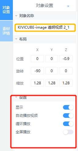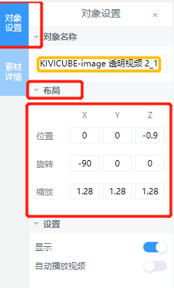 选中透明视频,点击右侧“对象设置”-“布局”,将x轴旋转改为-90°,三个轴的缩放调整为1.28,z轴位置改为-0.9,(根据实际情况,将透明视频与识别图边缘对齐)透明视频的位置就调整完成