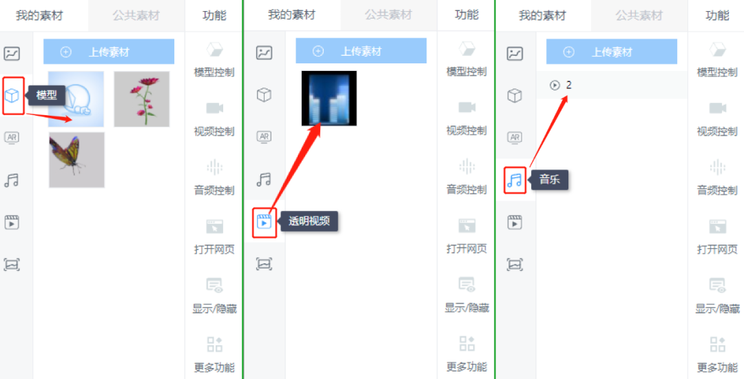 首先,进入“我的素材”,选择最左侧对应选项,依次拖入上传好的三个素材:模型素材、透明视频、音乐文件,调整场景内素材的位置、大小及方向。