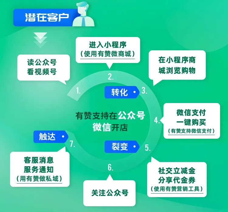 视频号享受着微信的公域流量,却能和微信私域生态,如小程序、公众号无缝打通,真正的实现企业私域和公域串联,且公域转私域更加方便,私域也可以更方便做裂变,形成「公域->私域->裂变->公域->私域」循环运营,帮助品牌塑造自有阵地。