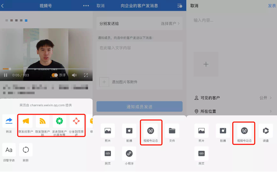 通过群发助手、客户朋友圈等功能,企业成员能向用户发送视频号内容。
