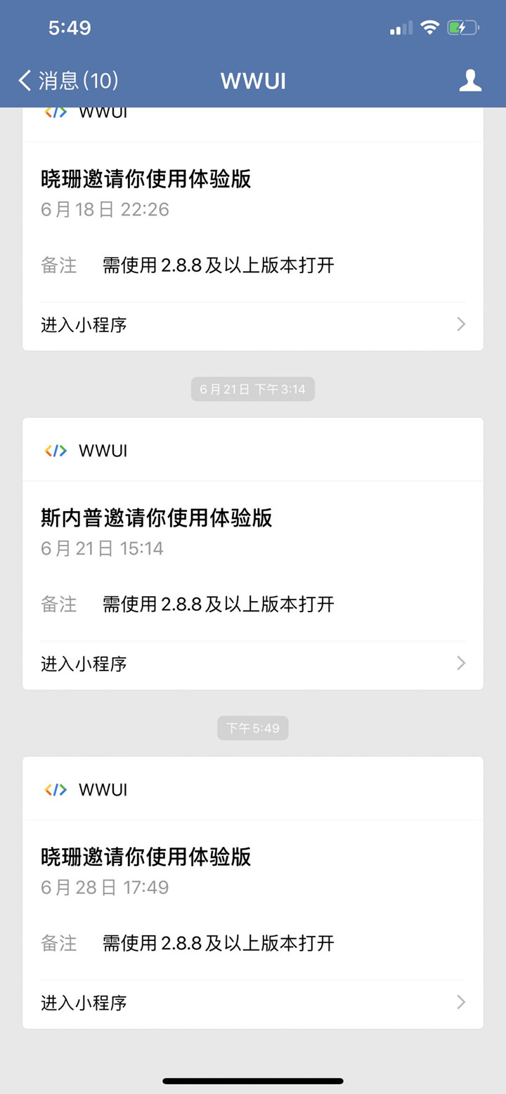 现企业微信小程序也支持配置体验版 (当前仅支持已发布的小程序且需已关联到企业) 步骤如下: 1.开发者在微信开发者工具生成二维码 2.开发者使用企业微信扫描二维码打开小程序开发版 3.点击进入右上角"…"–》点击配置体验版 4.进入页面选择体验成员后,发送体验邀请 5.成员将收到小程序通知,通过点击小程序通知卡片即可使用该小程序体验版