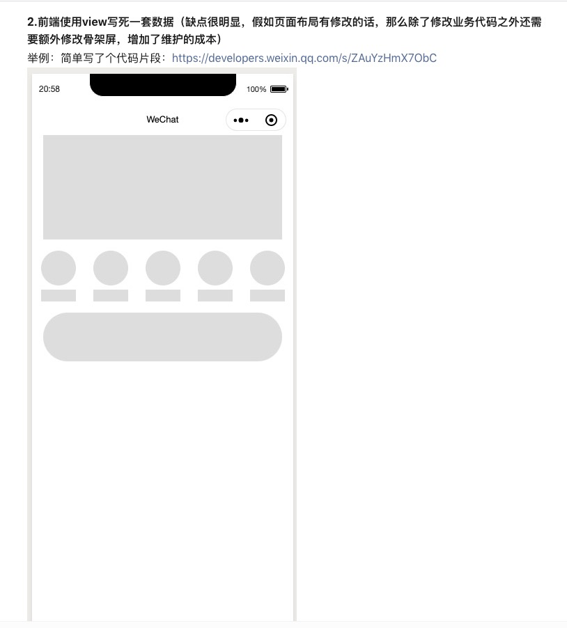 2.前端使用view写死一套数据(缺点很明显,假如页面布局有修改的话,那么除了修改业务代码之外还需要额外修改骨架屏,增加了维护的成本)