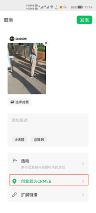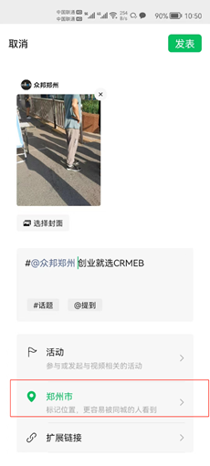 根据要求依次填写好“位置名称”“详细地址”“所属类别”,在这里“选择地区”自动默认了所在省市信息,只有地区是可选可调整的。比如你的所在位置是在河南省郑州市管城区,是不能修改成河南省洛阳市的。完成位置创建之后,测试发一条视频号作品,如图所示所在位置就变成了“创业就选CRMEB”,大家可以着手创建一下自己的“品牌位置”。