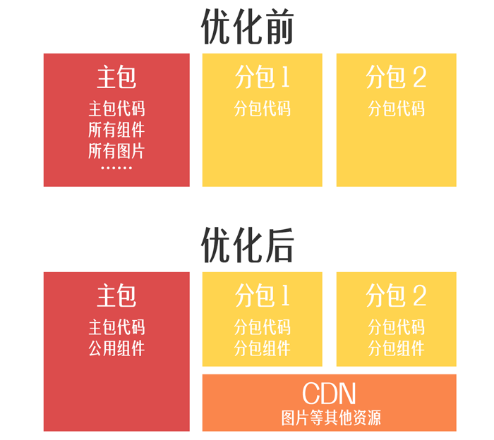 注意,subpackages配置路径外的目录将被打包到 app(主包)中。原项目在根目录下存了全局组件、样式、图片,导致主包非常大,一度逼近主包大小上线2M。这次把分包里的才会用到的组件,拆到分包所在的文件夹中;把图片资源放到CDN中。这样主包中只留下主包用拿到的代码和组件: