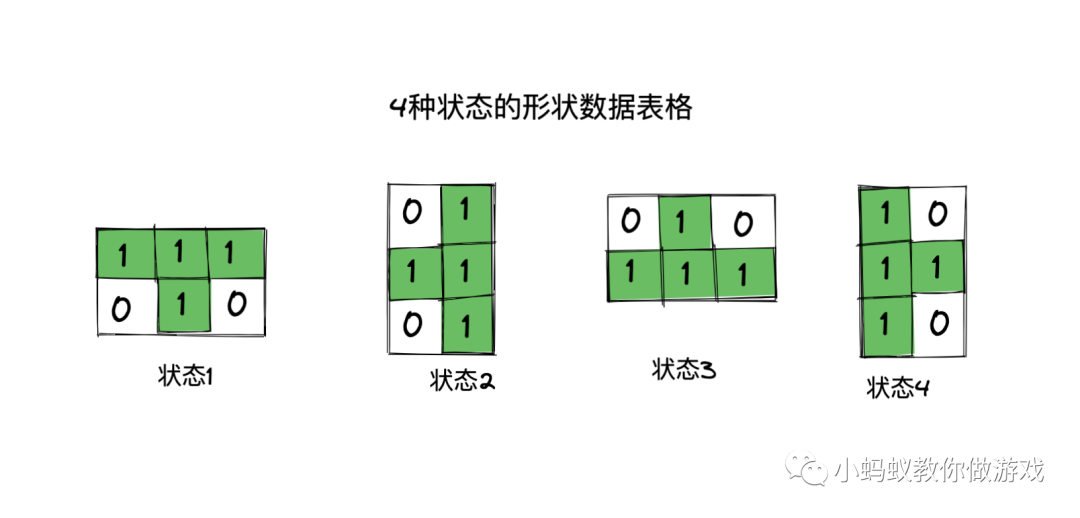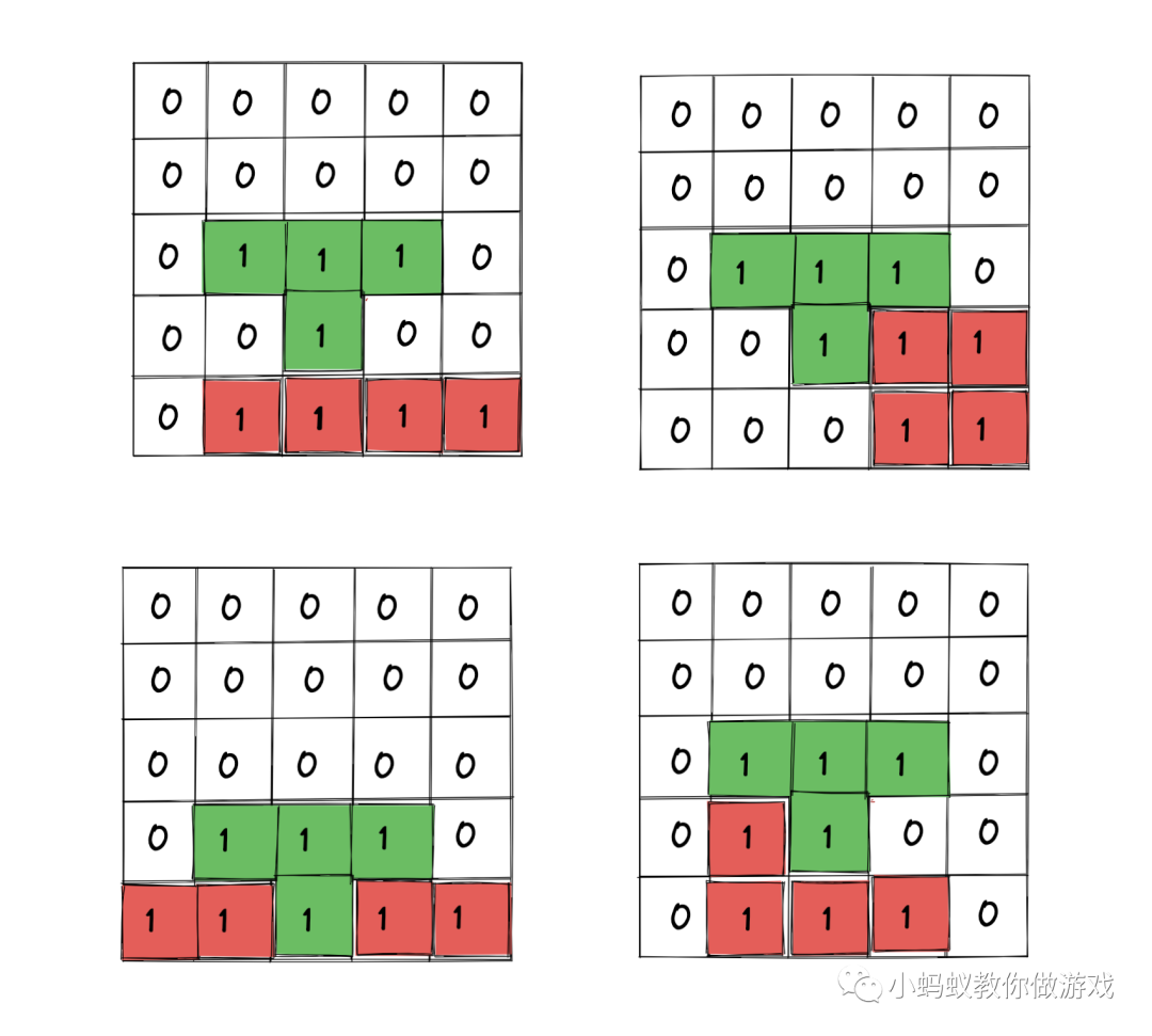 如图,是“形状1”在 4 种不同状态下所对应的数据表格。如果,我们能够知道形状上的每一个方块在整个数据表格中的位置(行列号),那么,就能够依次的判断出下方的位置是否有 1 了。