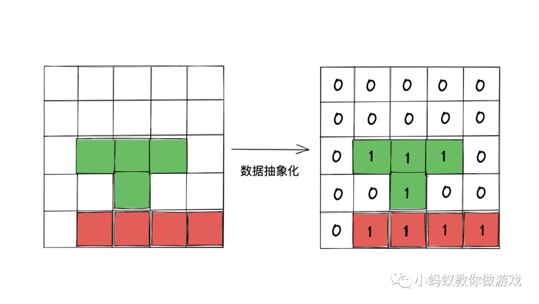 如图,右侧的图片是一个数据表格,这个数据表格与左侧的游戏界面是对应的。现在,我们用 0 表示空位置, 1 表示有方块,然后对照着左侧的游戏界面将右侧的表格填满。这样,我们就把当前的游戏抽象成了数据,这个就叫做数据抽象化。(之前专门写了一篇与数据抽象化有关的文章《所有消除游戏背后那些看不见的数字》,基本上所有的消除游戏都离不开它)