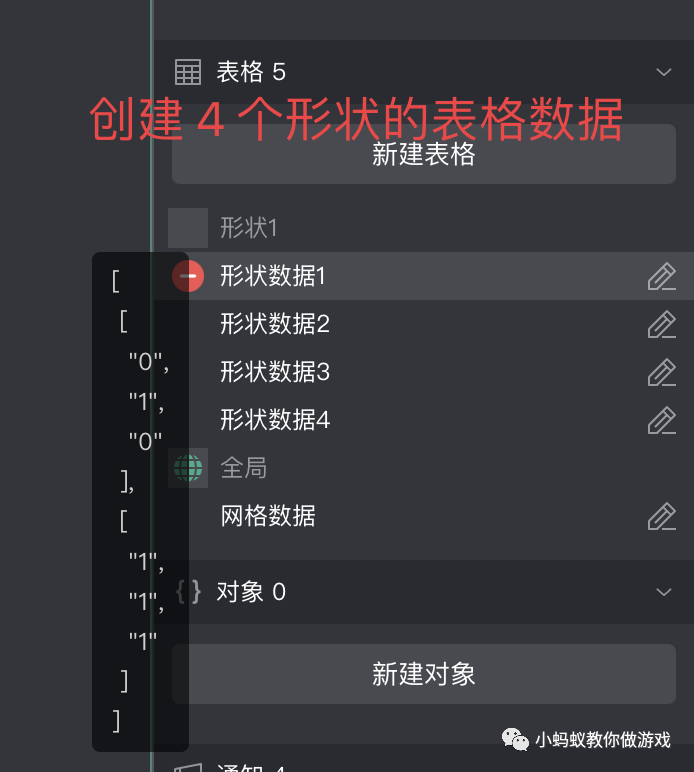 接着,我们为“形状1”创建 4 个表格数据,对应的就是它的四个状态。