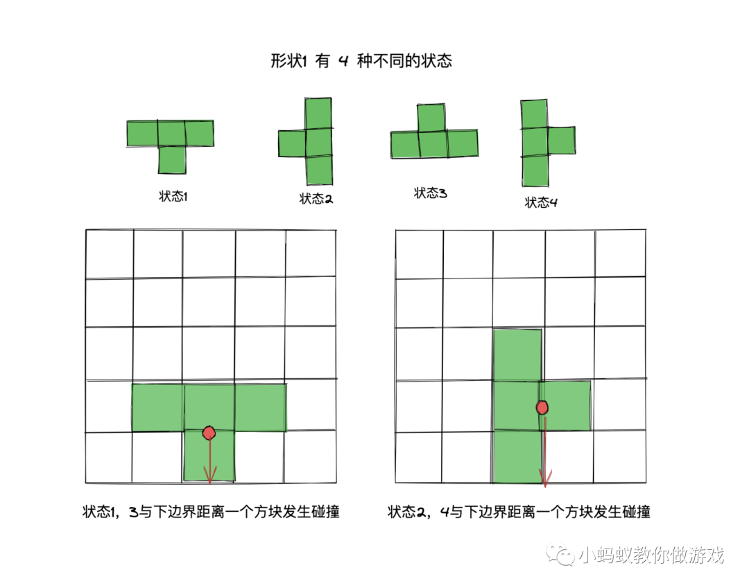判断起来也很简单,红色圆点代表的是形状当前的位置,由于形状的状态不同,判断是否与下边界发生碰撞的距离也不同,如图,在 1,3 状态下,与下边界的碰撞距离是 1 个方块长度,在 2,4 状态下,与下边界的碰撞距离是1.5 个方块长度。