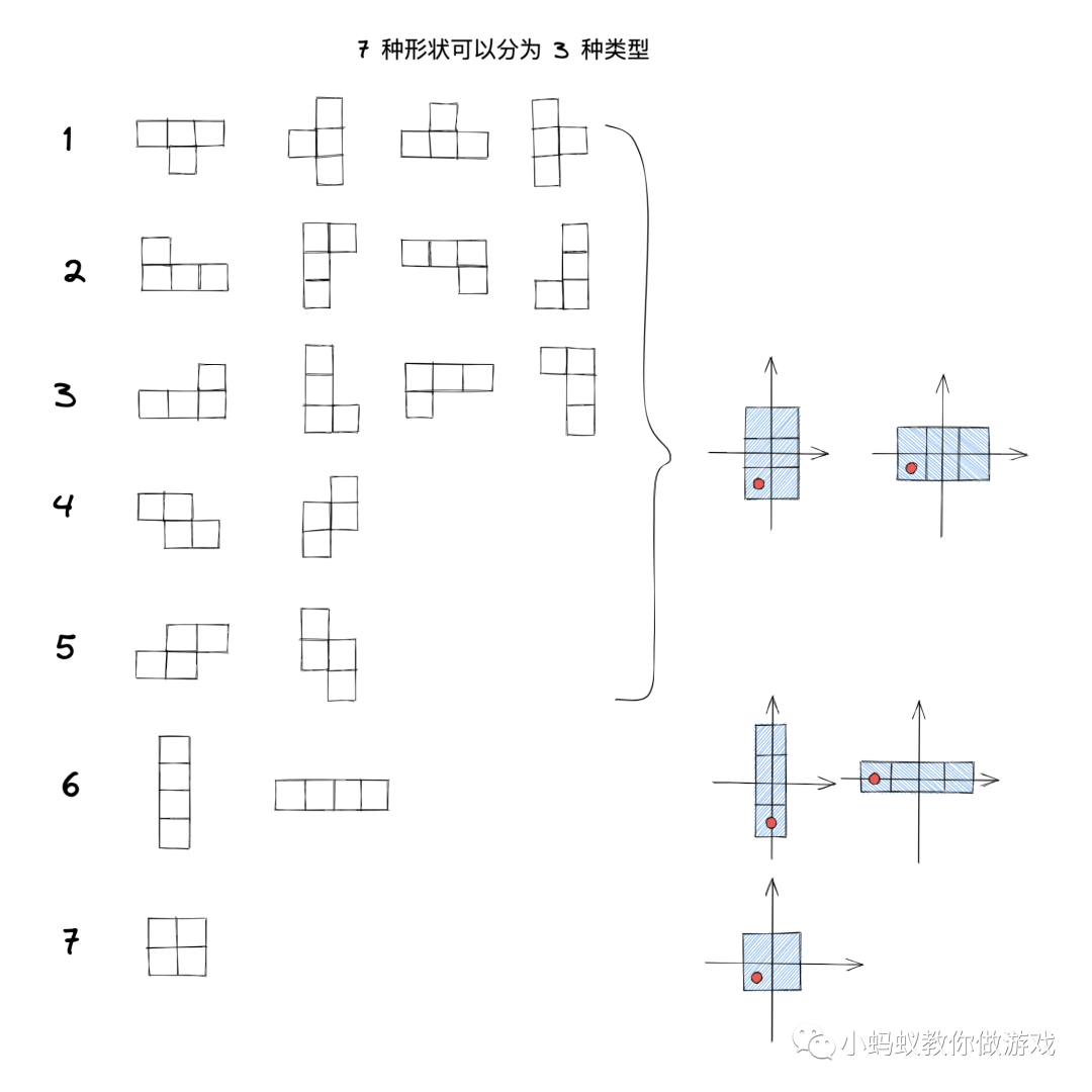 上方举的是“形状1”的例子,俄罗斯方块中一共有 7 种“形状”,按照其包围矩形的形状可以分为 3 种类型。
