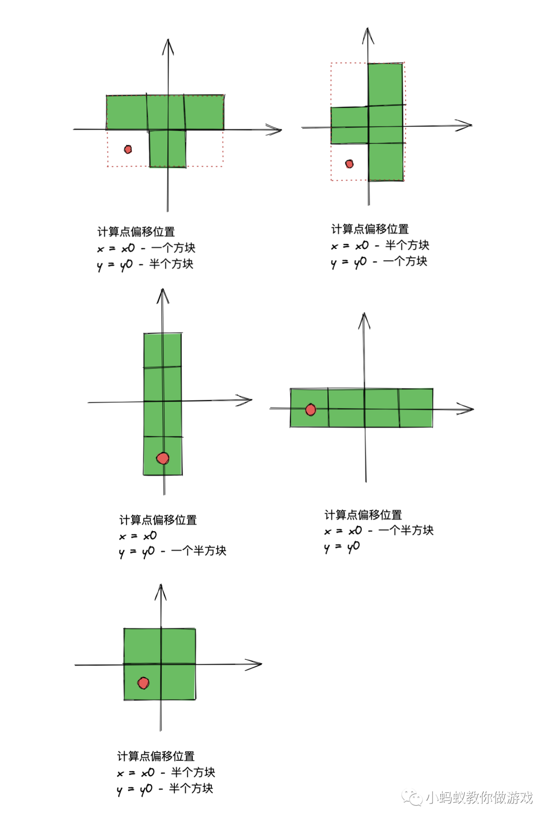 如图,我们把红色的点叫做计算点,坐标轴的中心是当前形状的位置(x0,y0),根据图片可以很直观的看出来不同状态下的计算点的位置。
