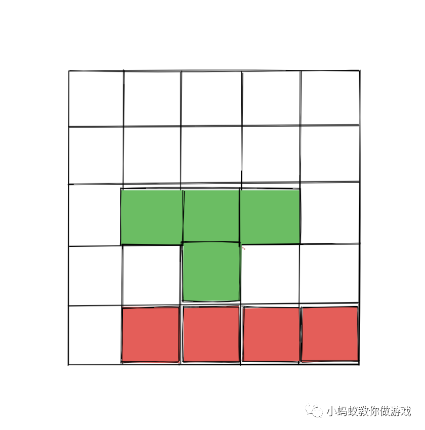 如图,下方的红色方块表示的是之前已经摆放的方块,上方的绿色方块是下落的“形状1”,此时,它们应该发生碰撞,绿色的形状应该停止向下移动,摆放在当前的位置上。