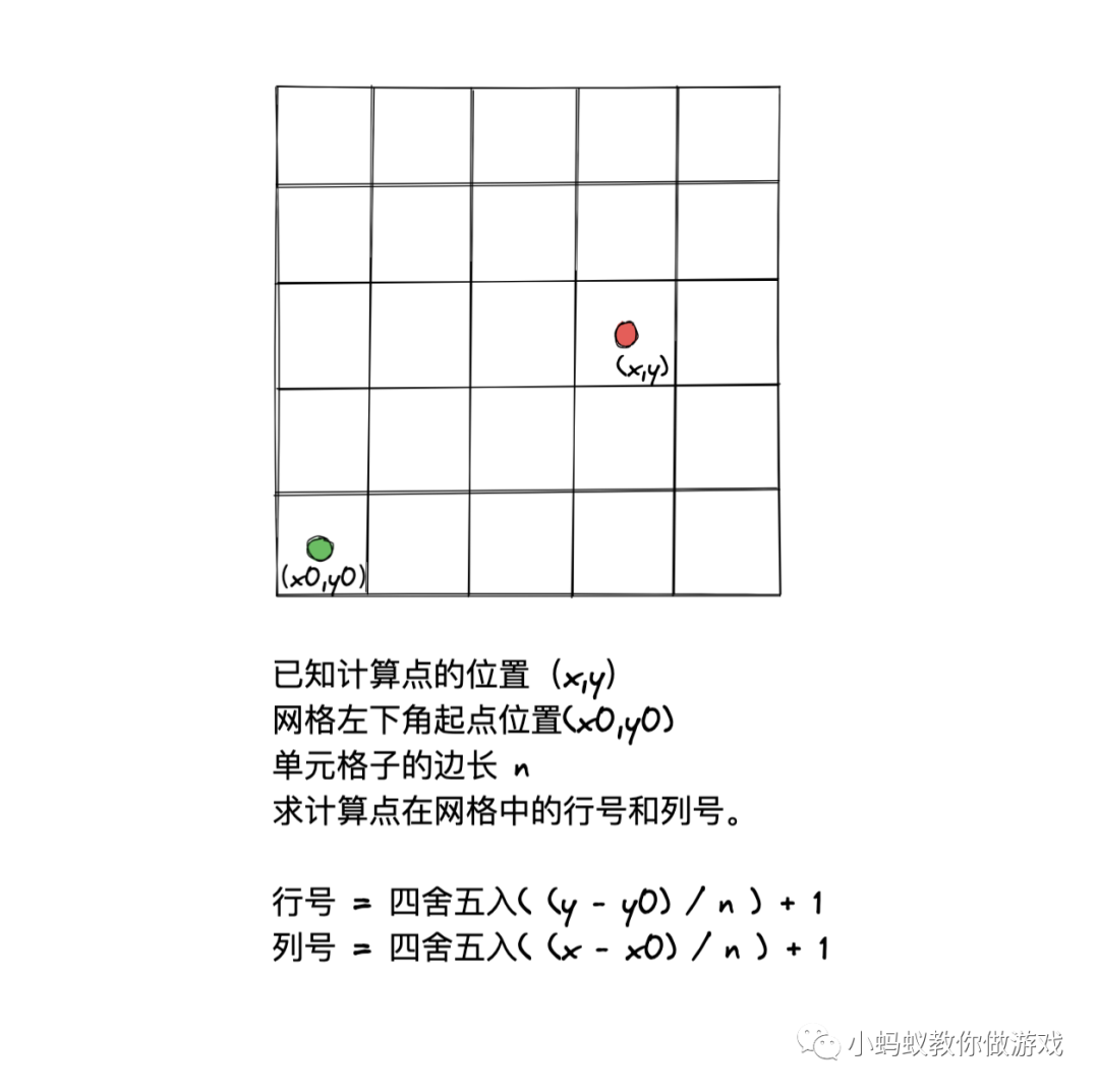 这里算出的计算点的位置是在游戏坐标空间中的位置,还需要将它们进行一次转换,因为我们需要知道的是计算点在数据表格中的哪一行哪一列。