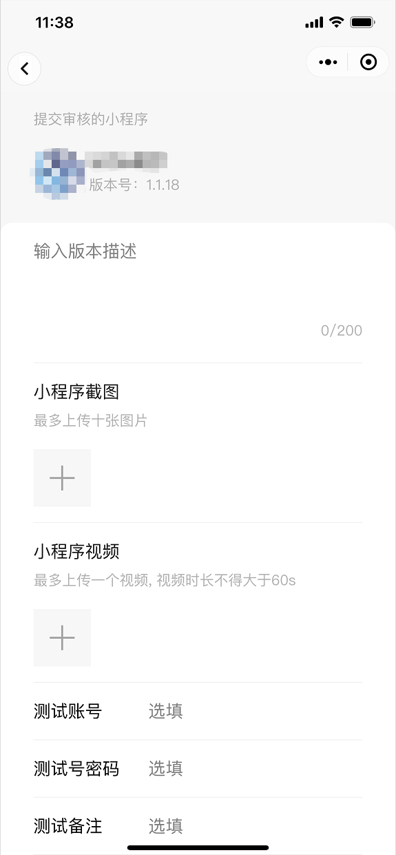 然后需要输入小程序的基本信息,和PC端基本一致,但是这里会多出一个小程序视频的上传入口,只有版本描述是必填的,其它可以选填,根据自己实际情况输入即可。