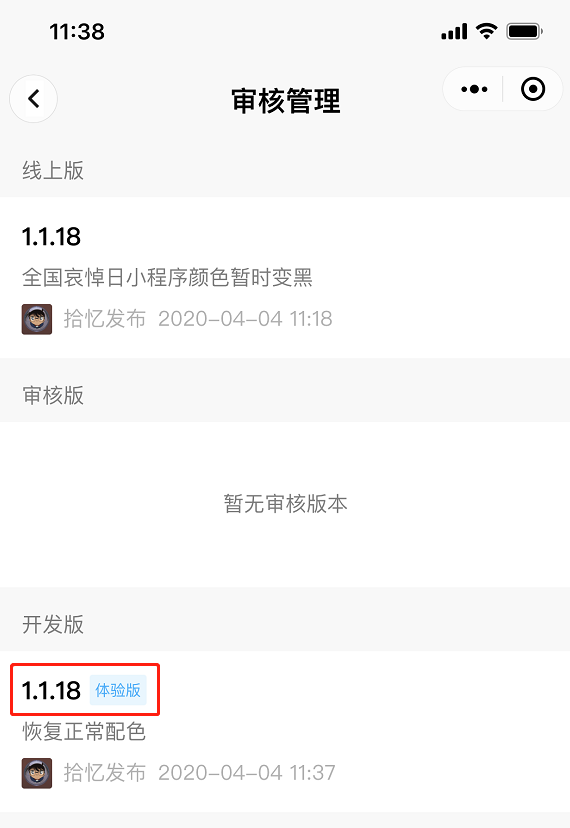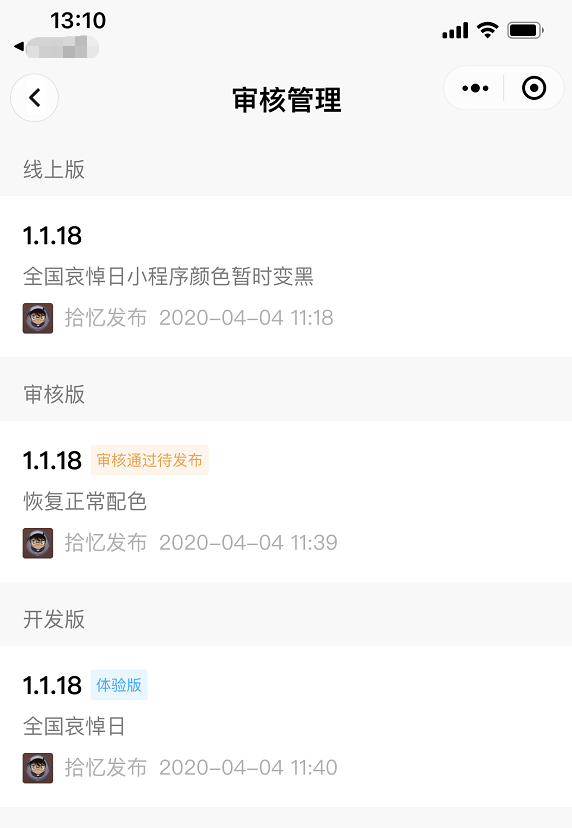 在审核管理中能看到 线上版、审核版、开发版 信息
