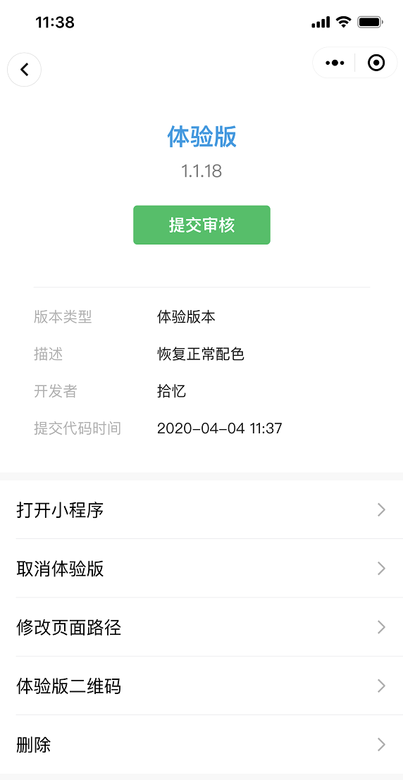 点开“体验版”可以对体验版进行简单设置,如修改页面路径、取消体验版、获取体验版二维码、删除等。