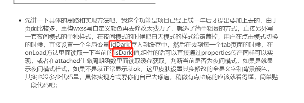 - 先讲一下具体的思路和实现方法吧,我这个功能是项目已经上线一年后才提出要加上去的,由于页面比较多,重构wxss写自定义颜色再去修改太费力了,就选了简单粗暴的方式,直接另外写一套夜间模式的单独样式,在夜间模式的时候把白天模式的样式给覆盖掉,用户在点击模式切换的时候,直接设置一个全局变量‘isDark’存入到缓存中,然后在去到每一个tab页面的时候,在onLoad方法里面读取一下当前的’isDark’值,组件的话可以直接通过properties传产同样可以实现,或者在attached生命周期函数里面读取缓存获取,判断当前是否为夜间模式,如果是就显示夜间模式样式,如果不是就正常显示就ok,这里皮肤设置其实修改的全是文字和背景颜色,其实也没多少代码量,具体实现方式要你们自己去琢磨,稍微有点功底的应该就看得懂,简单贴一段代码吧;