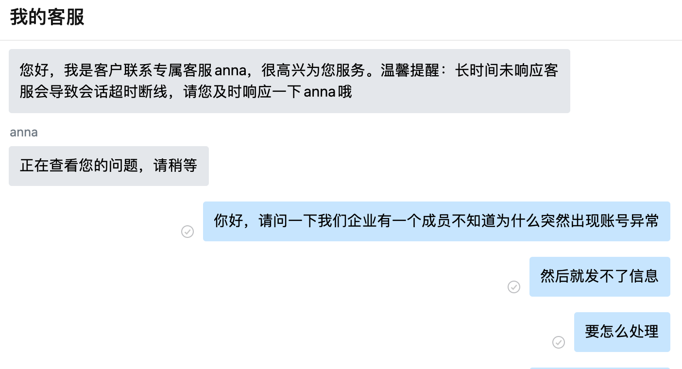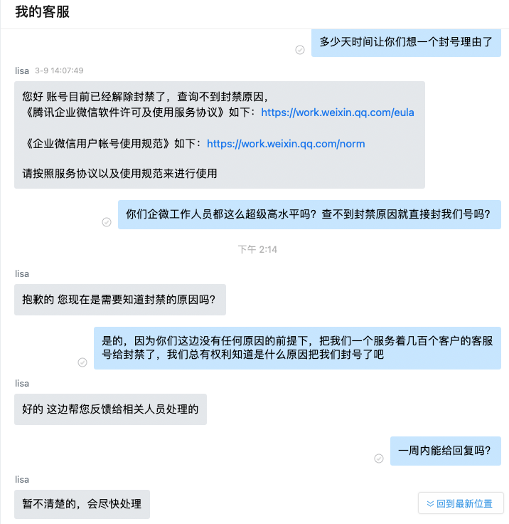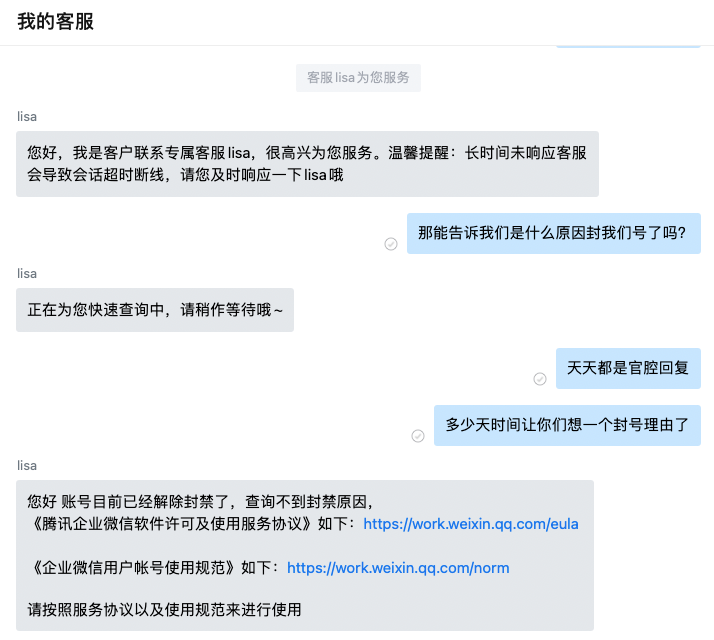 企业微信封号?还是第一次遇见吧,封得不明不白的,然后我们找了一番企业微信的客服渠道,找到了他们有一个人工客服通道,于是精彩的故事就这样开始了: