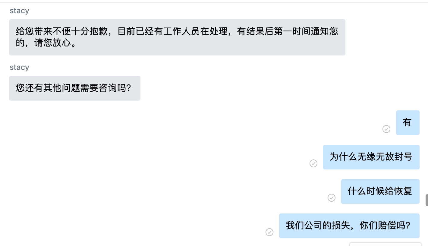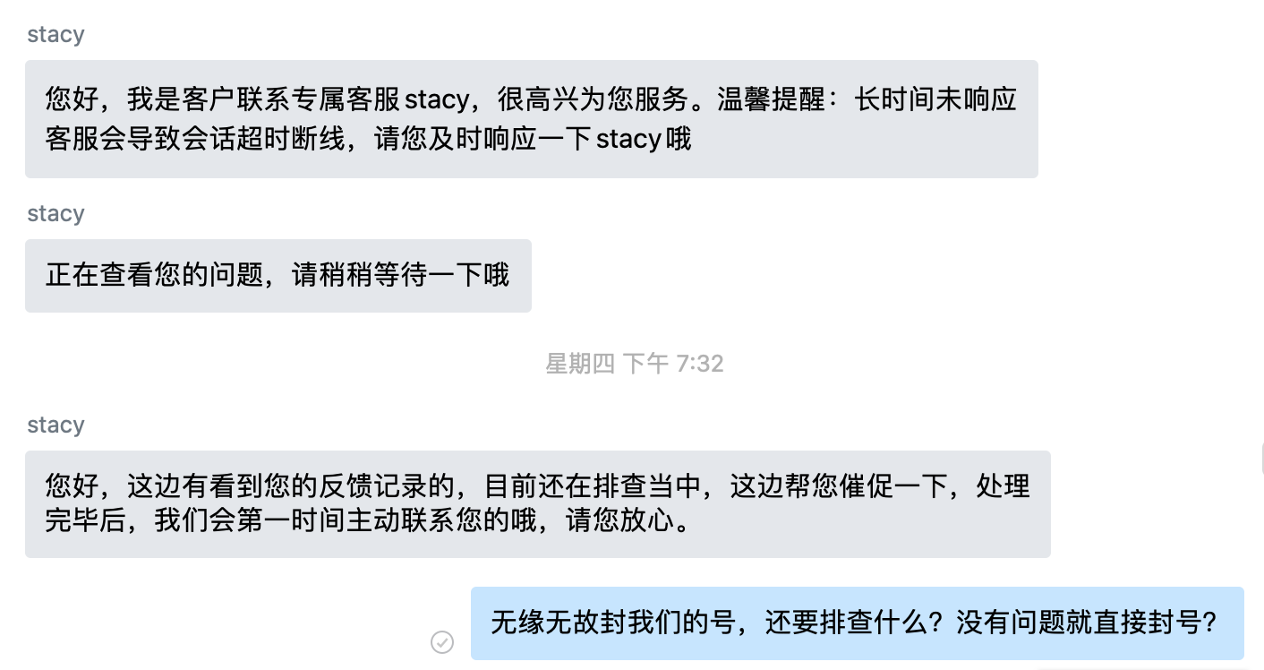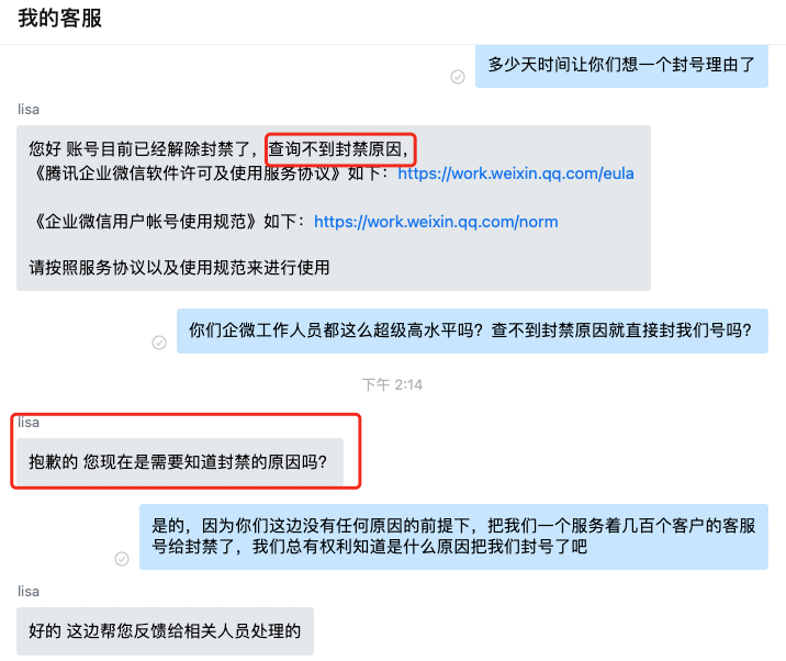 看到了吗?客服回复查询不到封禁原因。没有封禁原因你是封着玩的是吗?无缘无故封了四天,还敢问我否是需要知道封禁的原因。企业微信你们就这样玩吗?迟早把自己玩死吧。