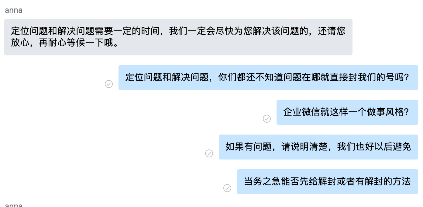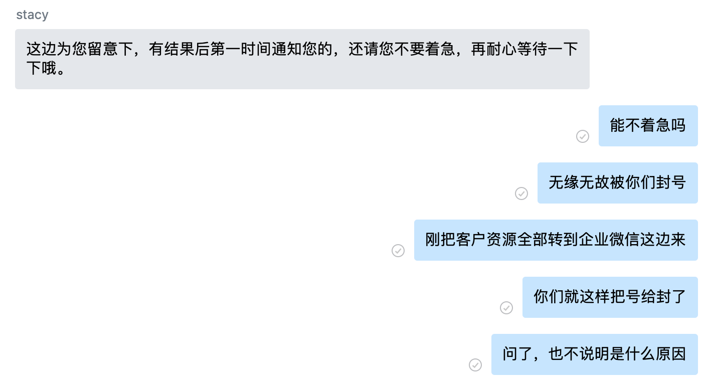 发此贴是为了告知企微官方,希望你们在随意封号前能考虑一下你们封的这个号是一个什么性质的号。不要随意践踏中小企业对你们的信任~