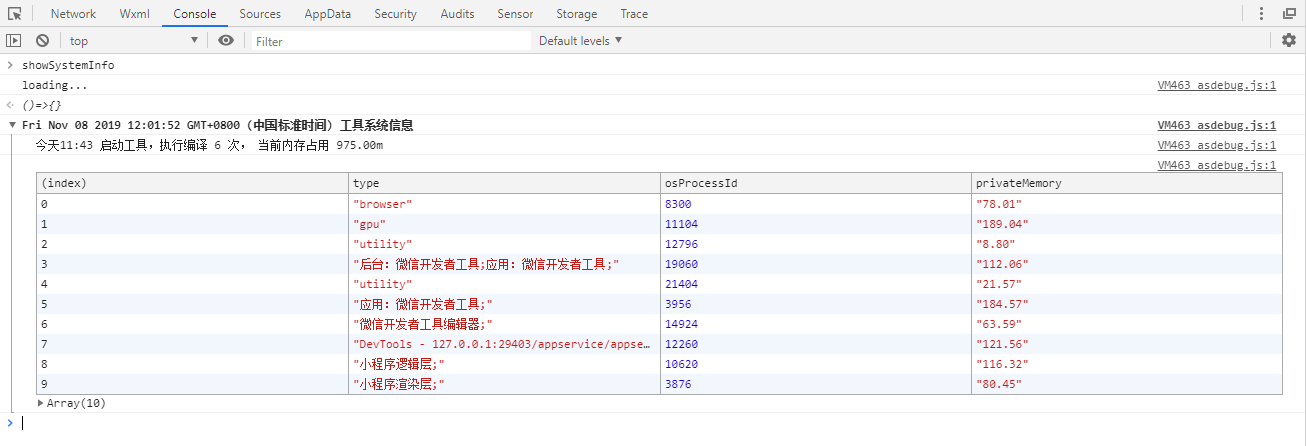 showSystemInfo 显示当前开发者工具占用内存及其他信息