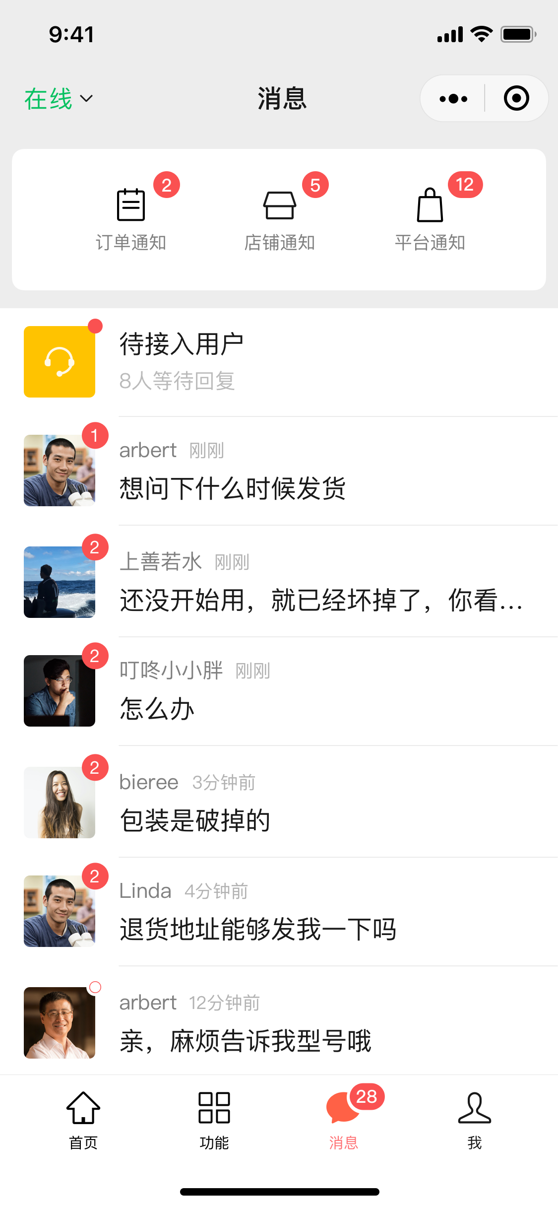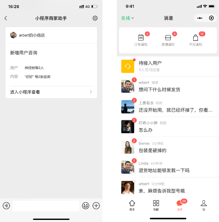 为便于商家更好地解答用户咨询,平台升级小商店客服功能。升级后,商家将可以及时接收平台通知、区分咨询接入状态和回复状态、在客服工作台发送商品/订单,提升客服的沟通效率。
