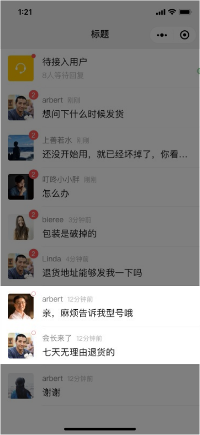 小商店助手的表现:点击未接入用户列表,可查看和接入用户咨询。