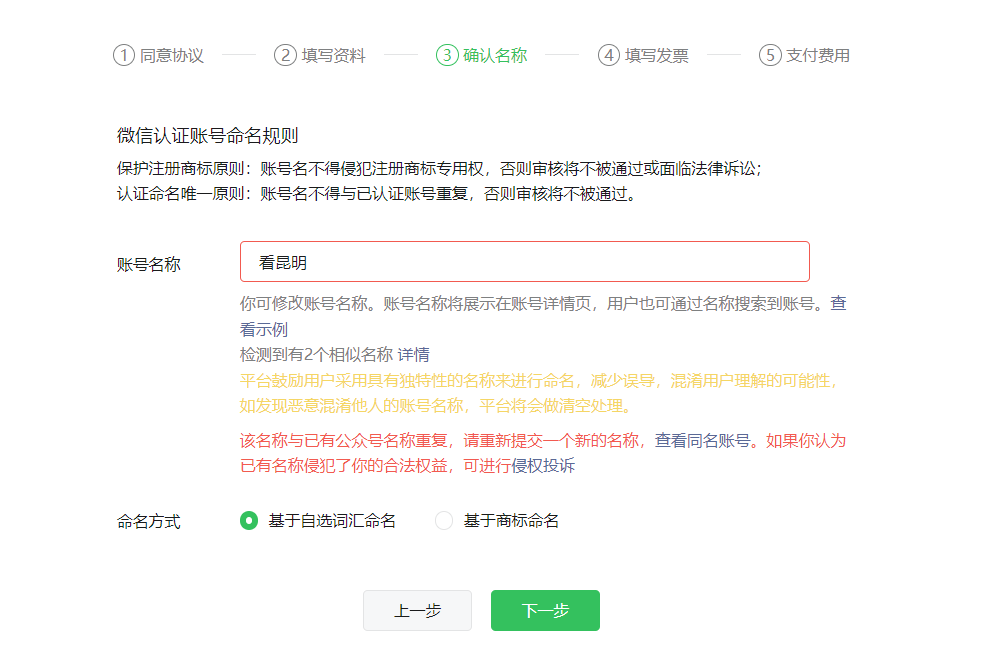 公众号主体变更 ,需要做账号迁移,不更新昵称,但是新账号名称认证一直显示有同名账号,怎么处理