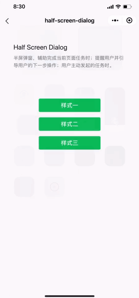 小程序提供了 wx.showModal、wx.showToast 供开发者进行页面交互,在开发过程中,可能需要自定义按钮相关的内容,所以 WeUI 提供了半屏弹窗让开发者可以有更多的自定义空间。
