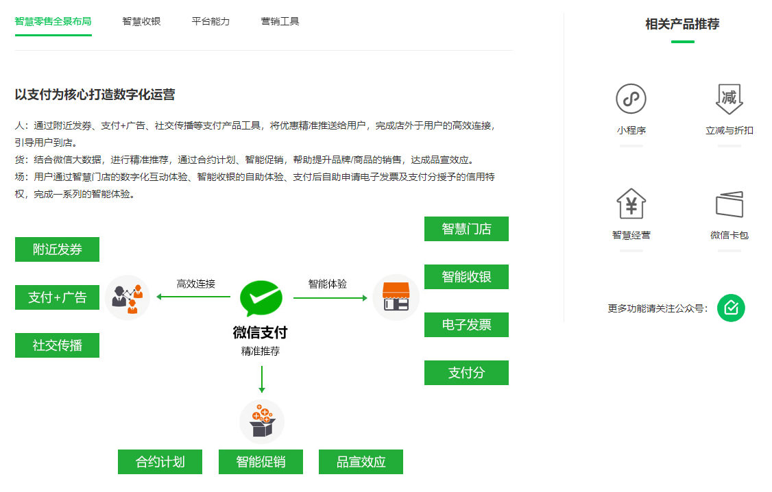 比如商超便利店,展示了全景布局打造方案,3套智慧收银方案,平台提供的会员、大数据营销、单品sku打通、电子发票多项能力,5套建议的营销玩法。
