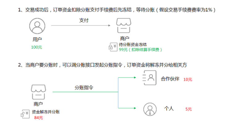商户将交易成功的资金,按照一定的周期,分账给其他方(员工、合作伙伴、返佣对象等),分账是基于订单维度,可单次或多次分账,一笔订单最多可以分20次,每一次可以分给50方。