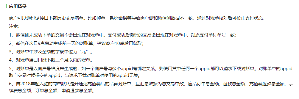 官方建议每天10点后获取,如果商户开通了免充值券,注意对账单字段会有差异。建议每天通过接口定时同步,以便快捷查账。