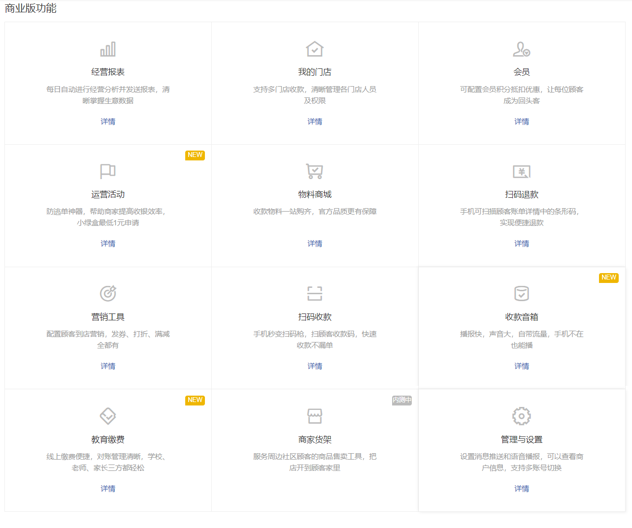 可自助开通,免开发,能够区分门店经营,支持信用卡收款,可自动提现到银行账号,支持接入硬件设备(收款机具和播报音箱)。还提供经营报表,可配置会员等。