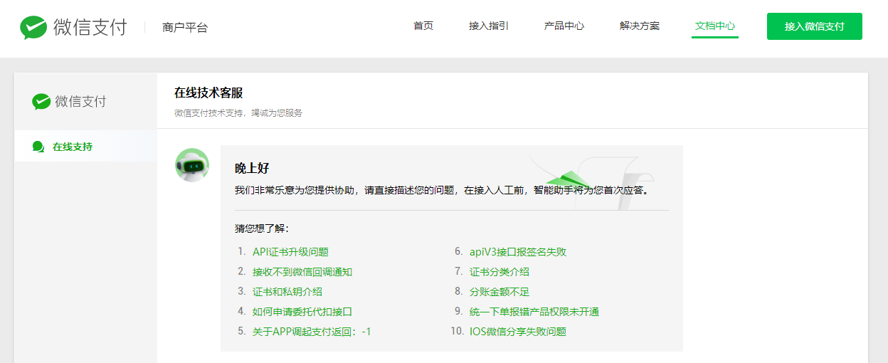 在商户平台文档页面,可以点击右侧浮动按钮“技术咨询”,官方提供在线技术客服支持。