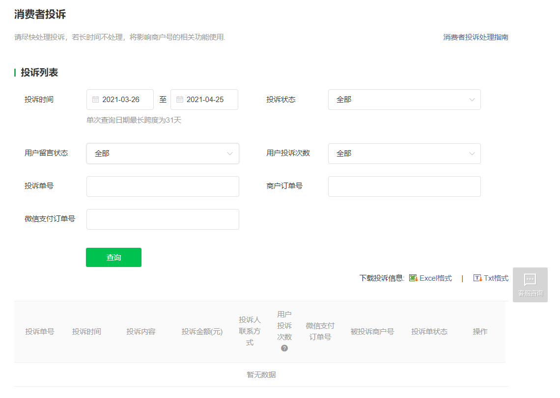 商户需要快速获取消费者投诉信息并进行处理,提高消费者投诉的处理能力及效率,避免被官方限制、警告。