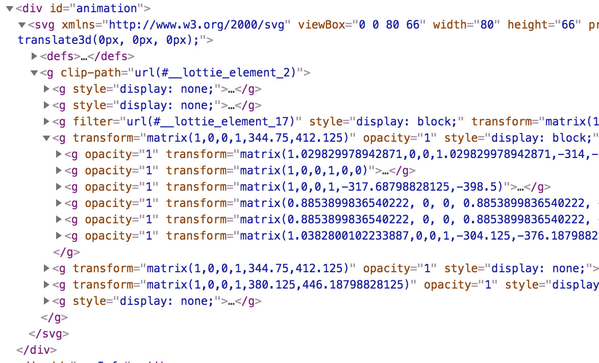 开启调试面板可以看到,lottie-web通过使用<g>标签的transform属性来控制动画: