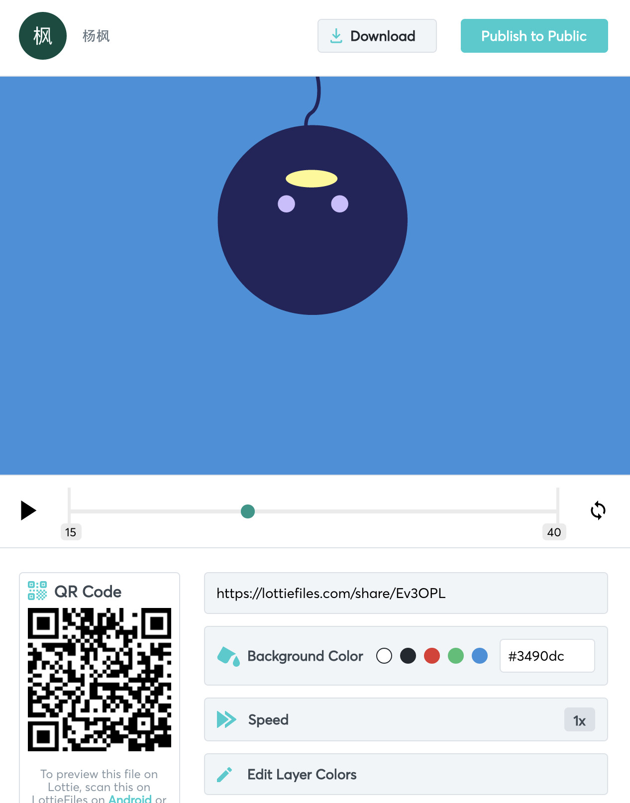 把生成的JSON文件传到LottieFiles平台,可播放、暂停生成文件的动画效果,可设置图层颜色、动画速度,也可以下载lottie preview客户端在iOS或Android机子上预览。