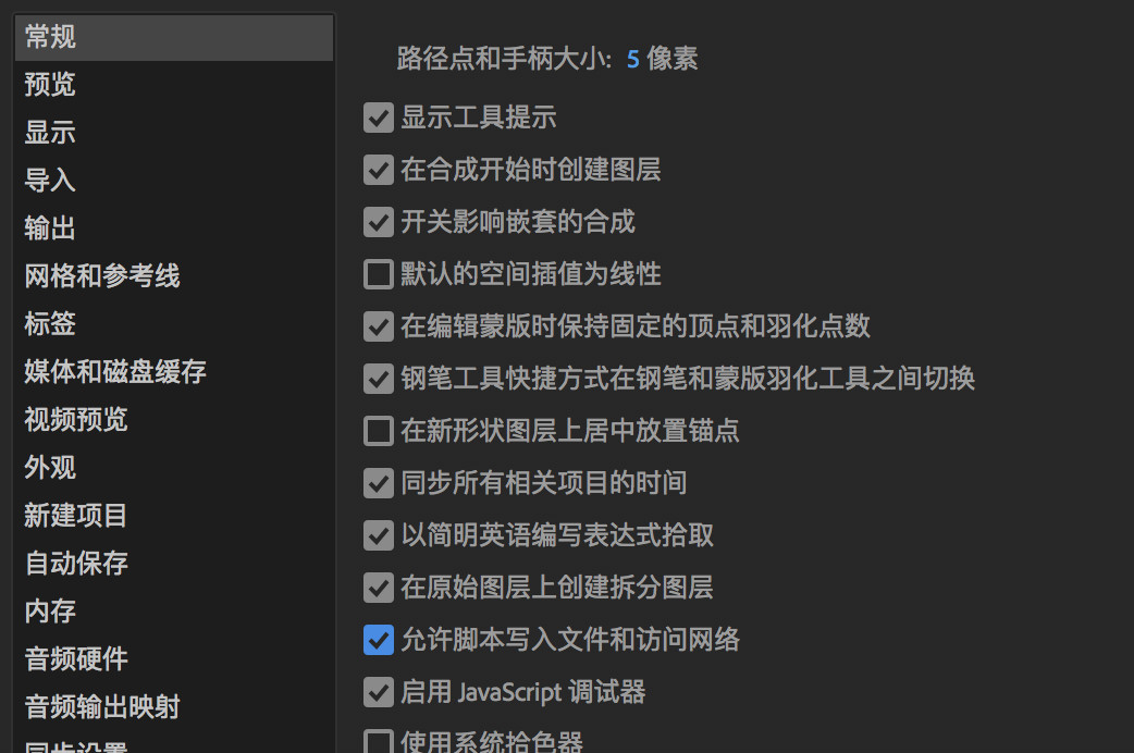 - 打开AE,在菜单首选项->常规中勾选☑️允许脚本写入文件和访问网络(否则输出JSON文件时会失败)