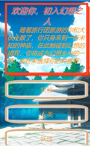 <text>随着旅行团旅游的你和大伙走散了,你只身来到一所未知的神庙,在此触碰到幻想的境界,你将成为幻想乡中的一员,现在来选择你的种族吧:</text>