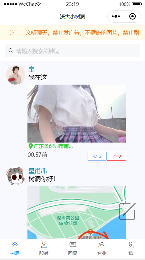 深大小树洞是一个匿名校园社交小程序,其目的在于给在校大学生一个匿名的社交平台。社交的形式分为树洞(类似于公开朋友圈)、私聊、公屏聊、评论回复、专业求助。这个作品是作者的第一个作品,由于参赛时期学业繁重、开发周期短、学习相关领域时间较短,有许多地方还需要进一步打磨。使用视频:http://m.v.qq.com/play.html?cid=&vid=t315162nvxm&vuid24=STrmsucnSiqyJFvVuLFj5A%3D%3D&url_from=share&second_share=0&share_from=copy&pgid=page_detail&mod_id=mod_toolbar