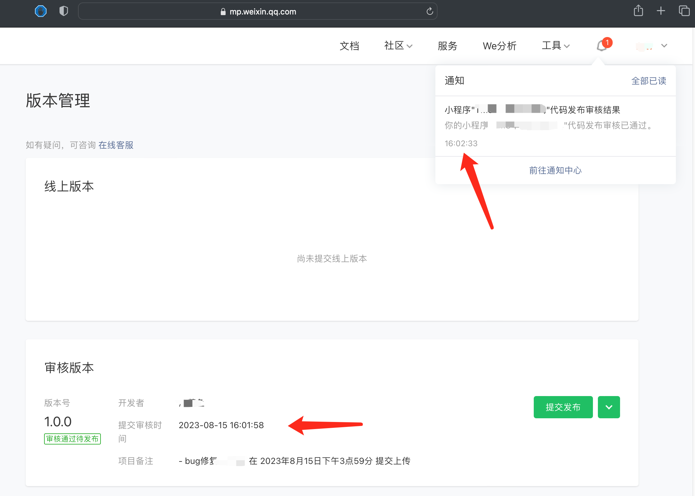 我这小程序,还是第一个’1.0.0’的版本, 从16:01到16:02,居然不到一分钟就审核完了…震惊~ 例如定位,相册啥的权限也都有用到的