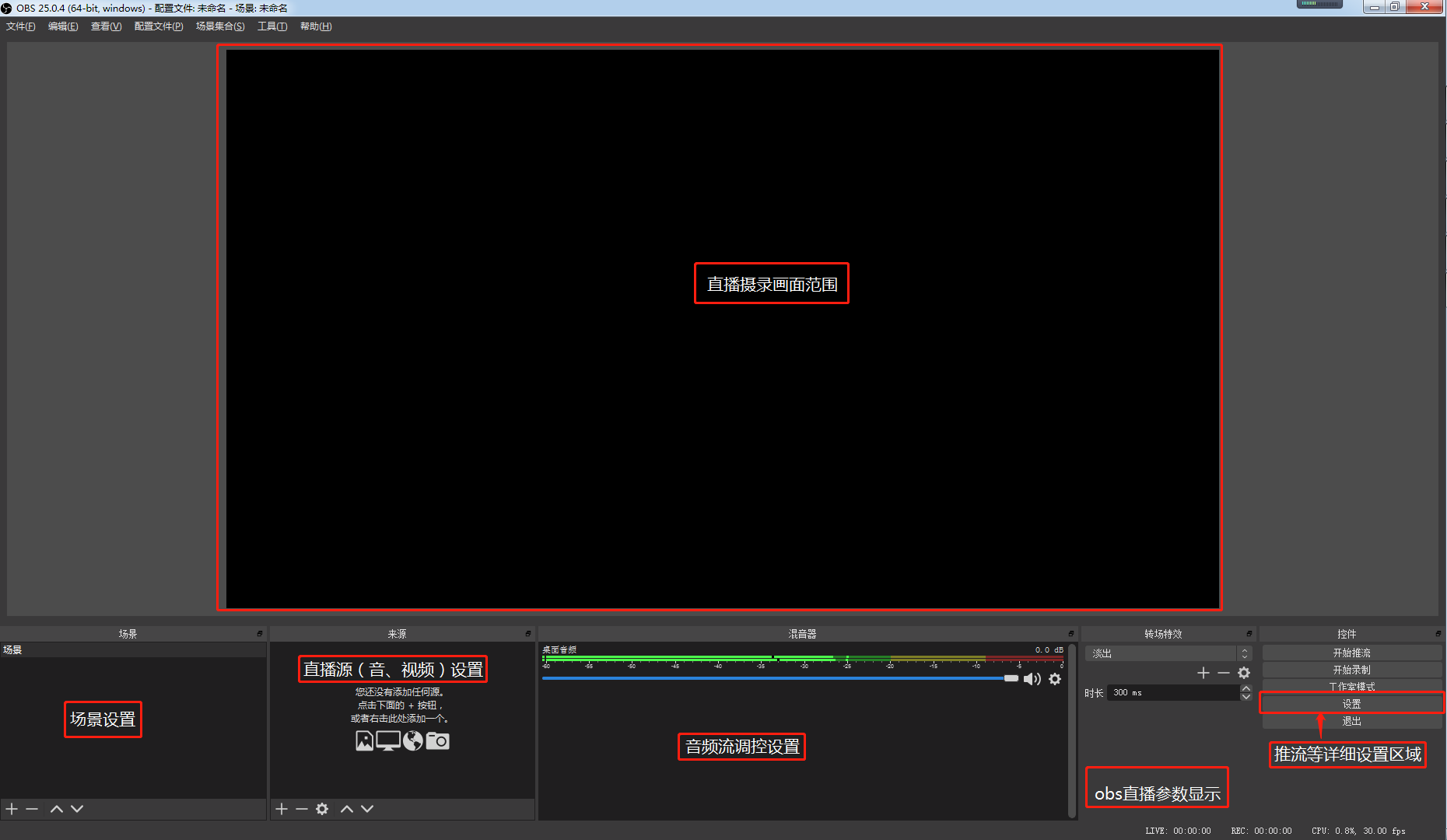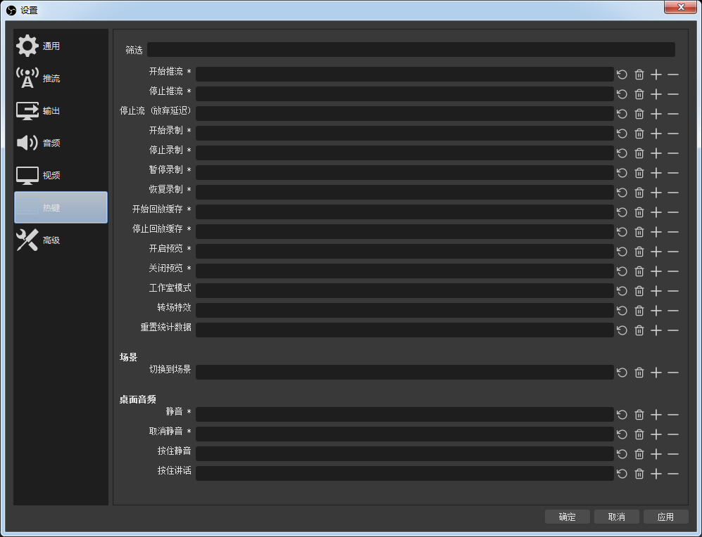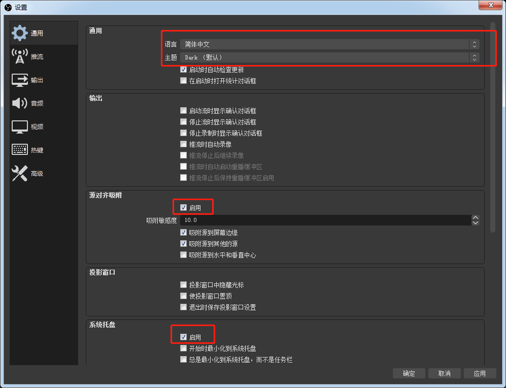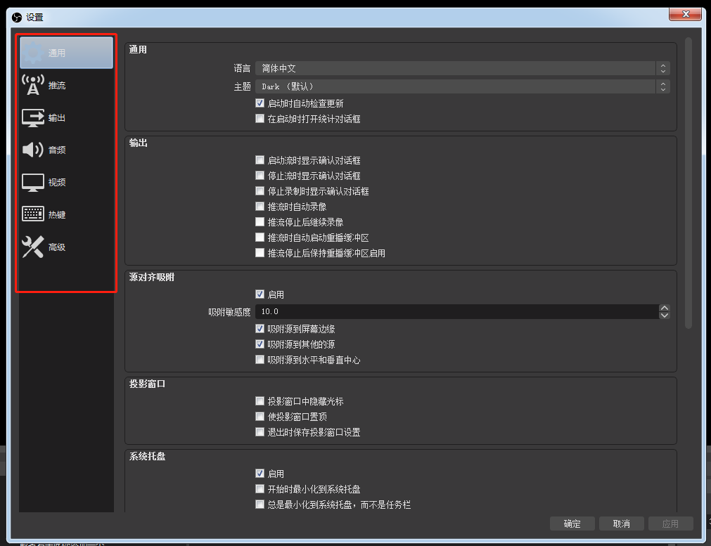 B:设置里包括:通用、推流、输出、音频、视频、热键、高级