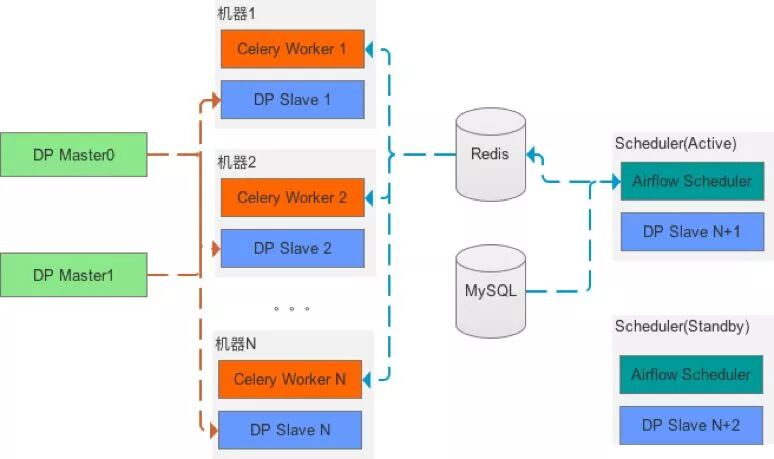 为了解决上述问题,我们调研了多种开源框架(Azkaban/Oozie/Airflow等),最终决定采用 Airflow + Celery + Redis + MySQL 作为 DP 的任务调度模块,并结合公司的业务场景和需求,做了一些深度定制,给出了如下的解决方案(参考图4):