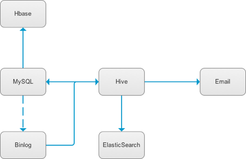 - 从 MySQL 通过 Binlog ,经过 Nsq/Hdfs/MapReduce 增量同步到 Hive( Datay ,自研)