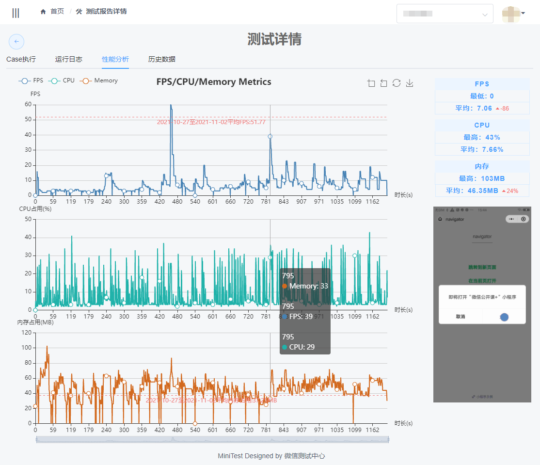 在平台跑查任意测试时,会自动获取跑查过程中的性能数据,并和现网的平均性能数据进行对比,方便开发者掌握小程序的性能情况。
